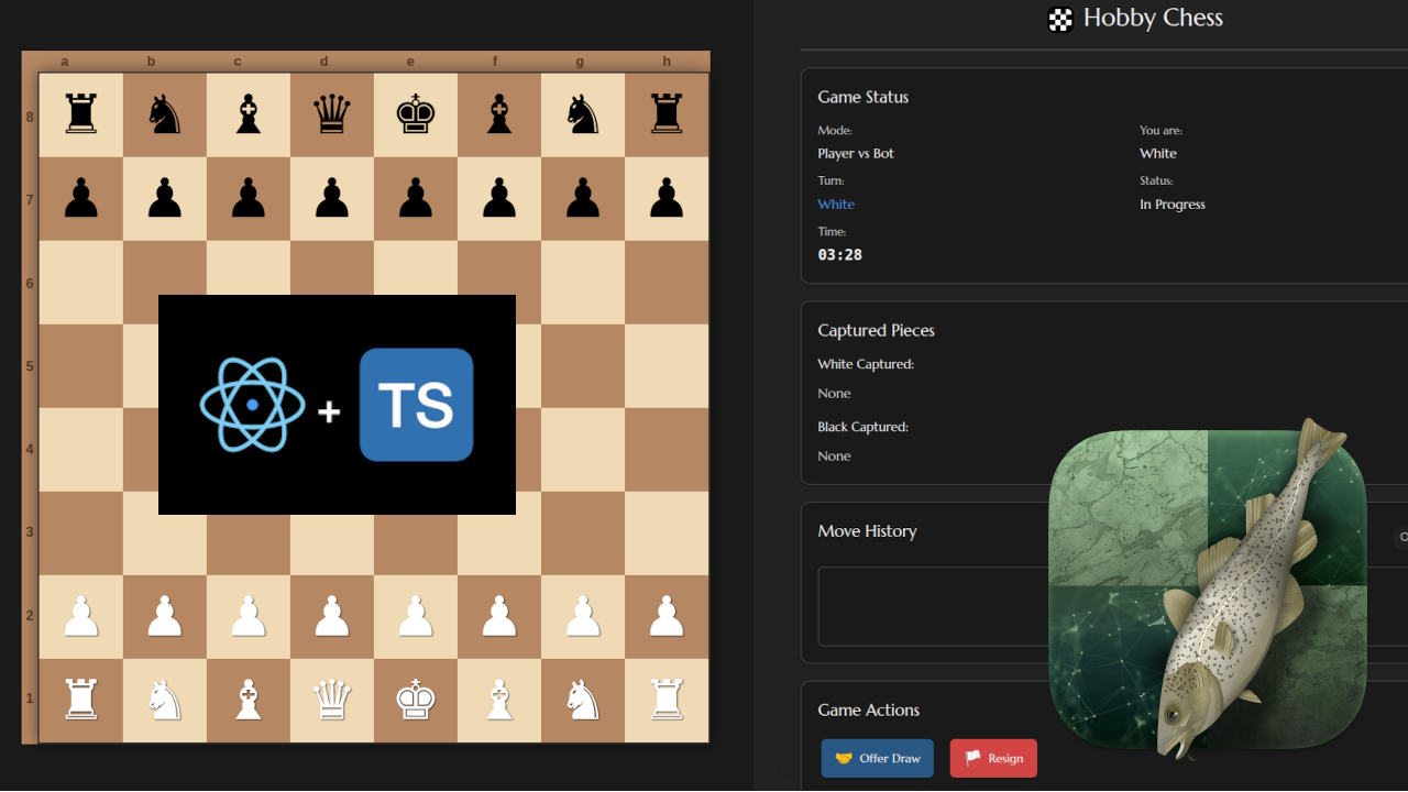 | Technology | Purpose | | --- | --- | | React | Component-based UI and state management. | | TypeScript | Ensuring type safety for complex board logic. | | Web Workers | Running Stockfish in the background without blocking the main thread. | | CSS3 | Responsive board design with notation labels and piece animations. |